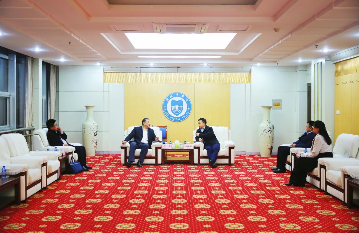 孙祥军首先代表学校对冯雷一行的到来表示欢迎,对省残联长期以来对滨医的支持表示感谢,并简要介绍了学校办学历史、办学传统、办学特色和近年来建设改革发展的基本情况,就学校“一优两特”发展布局、国家级特殊教育园区规划建设、大康复教育体系等进行了详细介绍。冯雷对我校积极承办中国高等教育学会特殊教育研究分会2020年学术年会、2020年山东省听障视障人员普通话培训测试培训班大力称赞,并仔细听取了我校近年来改革发展的基本情况以及在残疾人高等教育和康复高等教育方面形成的发展特色,对于我校敢为人先,开创残疾人高等教育先河;勇于创新,率先构建大康复教育体系给予高度评价。