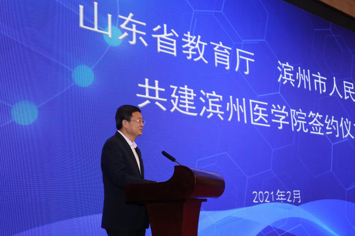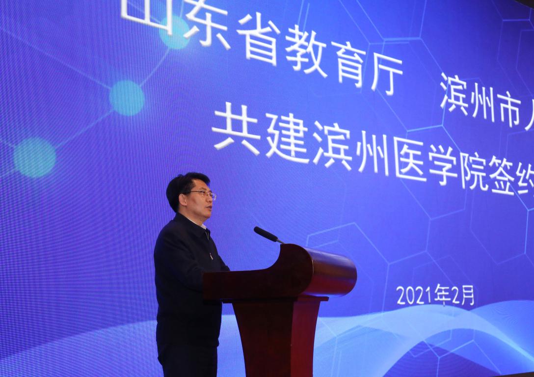 佘春明在讲话中指出,大学依城市而立,城市因大学而盛。省教育厅与滨州市人民政府共建滨州医学院,这是推进山东高等教育高质量发展的又一次重要实践,必将为现代化富强滨州建设注入动能强劲的智力引擎。50年来,滨州医学院主动融入发展大局、主动服务地方需求,扎根办学、接续奋斗,为全市经济发展、社会服务、科技创新、人才培养作出了重大贡献,滨州人民对学院有着高度的认同感、归属感和情结。这次签约,既是厚重历史的延续,更是高质量发展和创新发展的见证,必将进一步提升滨州医学院的办学层次和综合实力,成为省市共建、校地共赢的成功范例。滨州医学院及滨医附院的许多优势学科、特色专业与滨州实施科教强市工程的方向高度一致,与发展医养健康产业、建设“健康滨州”的理念高度契合。这次签约,必将更好整合优质教学和医疗资源,有力推动高校建设、医疗事业、医学科研与健康产业融合发展,为滨州经济社会高质量发展注入强劲动能。