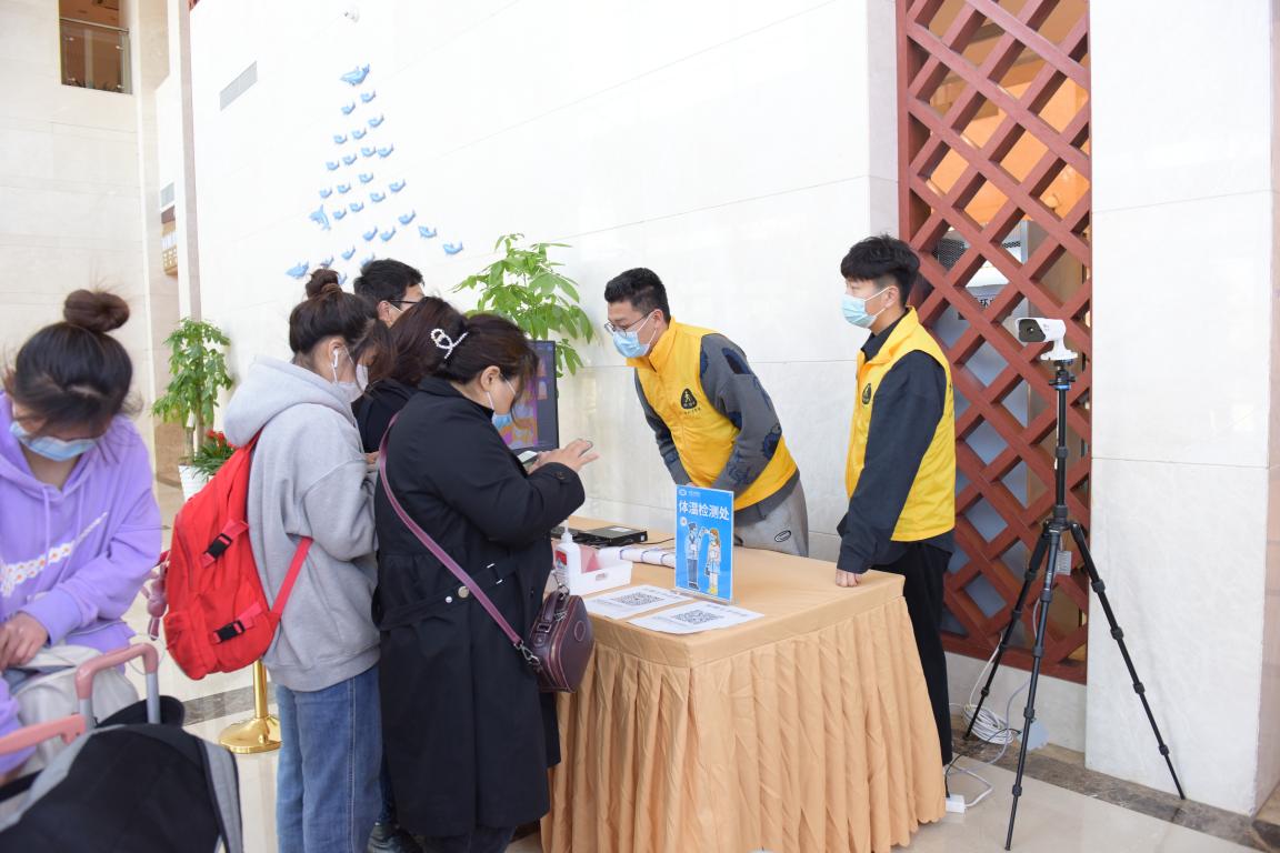 13日报到现场,特殊教育学院老师以及志愿者团队耐心与考生沟通答疑,严格进行测体温、查看健康码、分组核验视障生听障生身份证、残疾证、高考报名表、考试安全承诺书、考生陪同人员安全承诺书信息是否有误等报到环节,帮助残障考生完成报到程序。