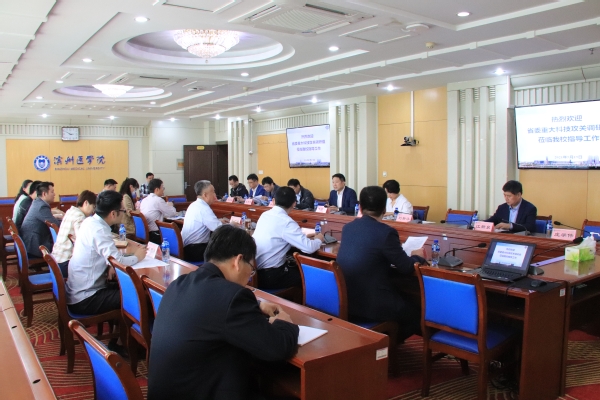 5月19日下午,省委重大办科技攻关调研组车彦松副组长带队一行7人到我校调研重大疾病和传染病防治科技攻关工作,烟台市卫健委金玲、闫程翔同志陪同调研。副院长王广成参加调研并致辞,科学技术处及相关学院负责人、烟台附属医院及附属烟台山医院科研部门负责人、部分科研创新团队学术骨干参加调。