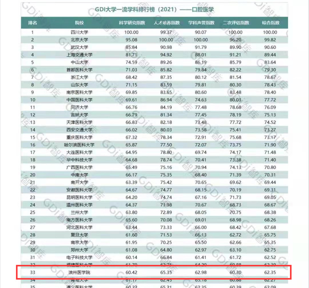 6月15日,广州日报数据和数字化研究院 (GDI智库)发布“GDI大学一流学科排行榜(2021)”,我校口腔医学全国排名33名,比2020年提升8个名次,位居山东省内同类院校榜首。