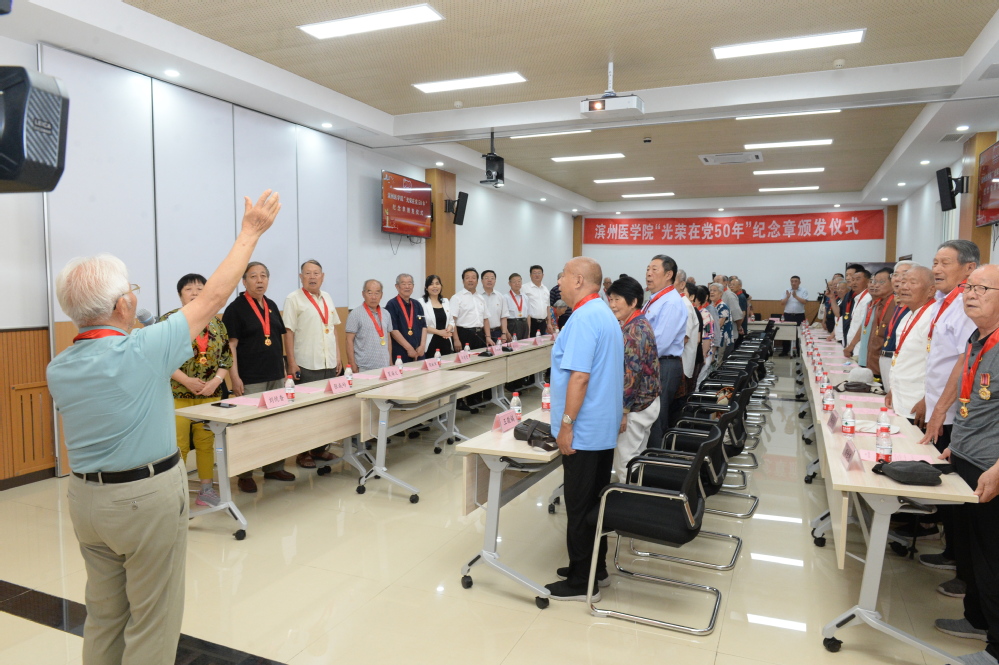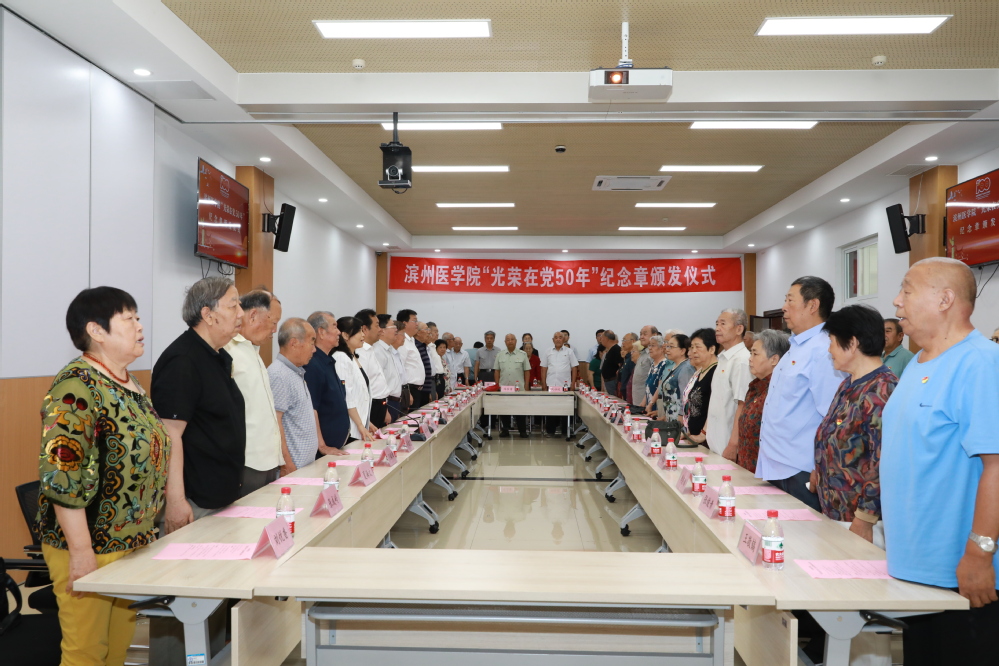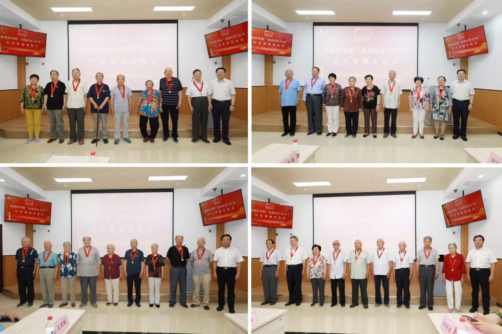 在全国上下隆重庆祝中国共产党成立100周年之际,为进一步传递党的关怀温暖,6月25日上午,学校在滨州校区文博学堂举行“光荣在党50年”纪念章集中颁发仪式。副院长吕长俊,校党委委员、组织部部长周连顺出席仪式并为51名“光荣在党50年”老党员代表颁发纪念章。党委组织部、离退休工作处、滨州附属医院(第一临床医学院)等相关负责人参加仪式。