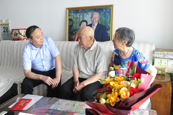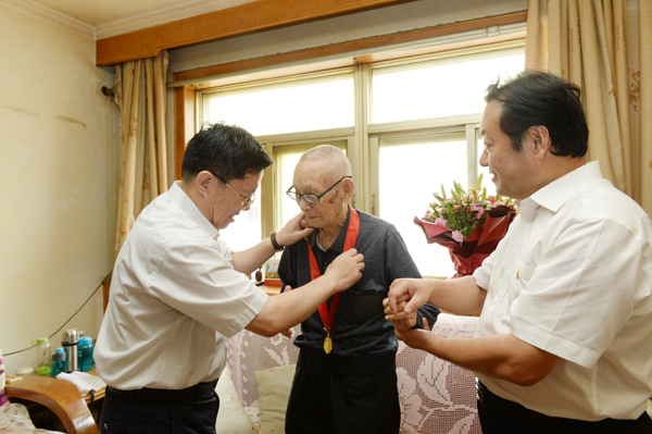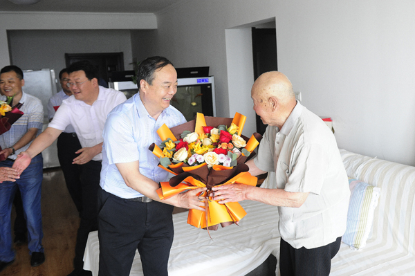 6月28日上午,党委书记车先礼,党委委员、组织部长周连顺一行走访慰问烟台校区中华人民共和国成立前老党员,为他们佩戴“光荣在党50年”纪念章,并奉上鲜花和慰问金,致以崇高敬意和诚挚慰问。
