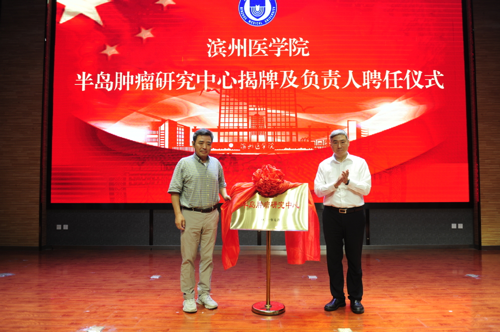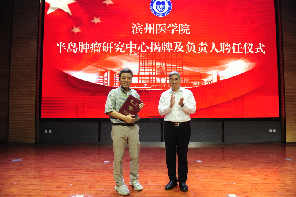 开幕式上,国家973项目首席科学家秦樾领衔的滨州医学院半岛肿瘤中心揭牌,院长赵升田为秦樾颁发聘书。
