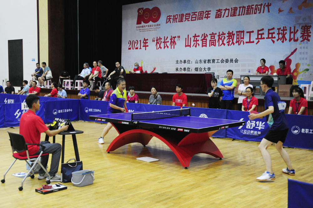 7月6日上午,由山东省教育工会委员会主办、烟台大学承办的“校长杯”山东省高校教职工乒乓球比赛在烟台大学大学生活动中心拉开战幕。来自全省59所高校的60支代表队,包括70名校领导在内的近500名运动员、教练员、领队共赴盛会,精彩竞技。