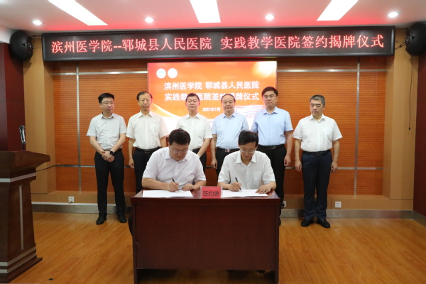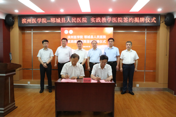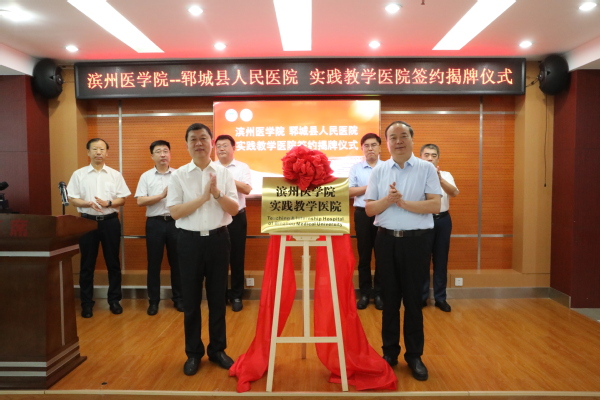 7月20日上午,滨州医学院-郓城县人民医院实践教学医院签约揭牌仪式在郓城县人民医院会议室举行。校党委书记车先礼与郓城县委书记姜凌刚分别致辞并共同为“滨州医学院实践教学医院”揭牌。实践教学管理处处长陈方民、滨州附院(第一临床学院)党委书记赵景刚分别与郓城县人民医院党委书记李庆利签署实践教学医院协议书和滨州附院(第一临床学院)帮扶郓城县人民医院协议书。郓城县政府副县长张俊阁主持签约揭牌仪式。