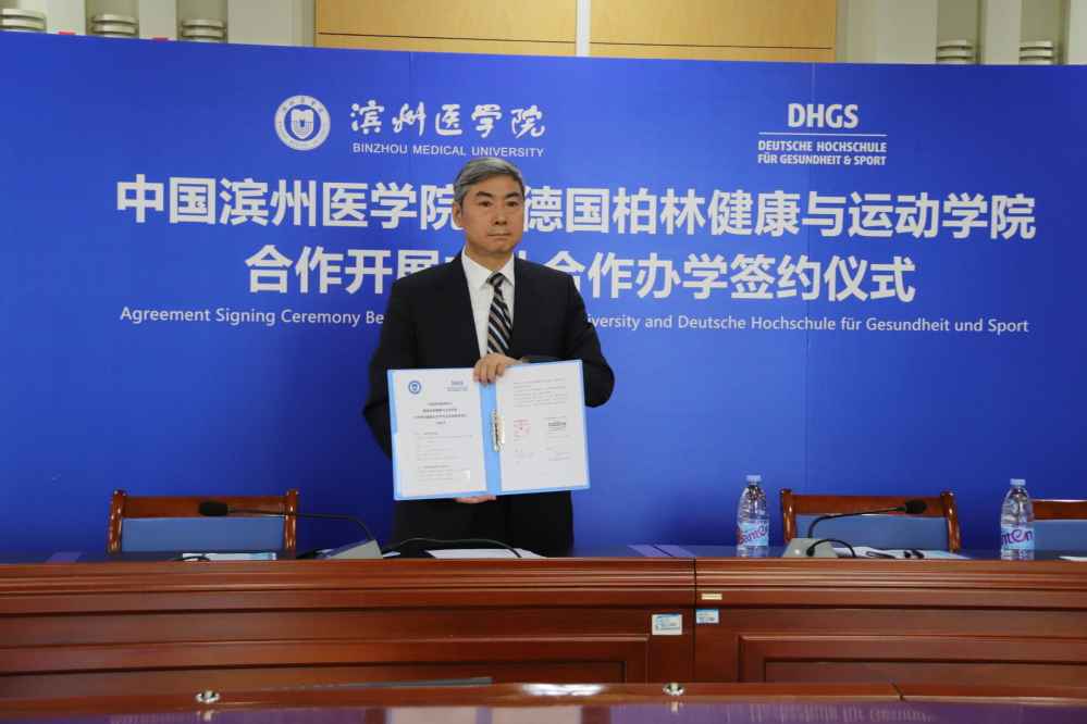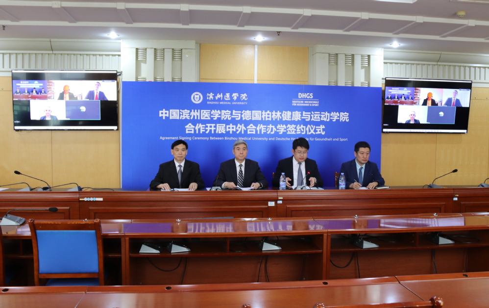 两位校长在线上完成了协议的签署,共同启动中国滨州医学院与德国健康与运动学院合作举办康复治疗学中外合作办学项目。