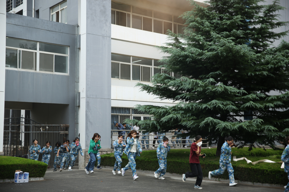 按照预案计划,上午9:00整,学生公寓B1楼突然冒出“滚滚浓烟”,3楼发生“火情”。警务室收到“火警”警报后,在第一时间拨打“119”进行报警,并迅速启动紧急疏散预案。学校相关部门人员接报后迅速赶到现场处置“险情”。楼内学生在由辅导员、宿舍值班员、物业保安组成的疏散引导组的组织下,从各楼层有秩序的快速疏散,迅速撤离到安全地带。