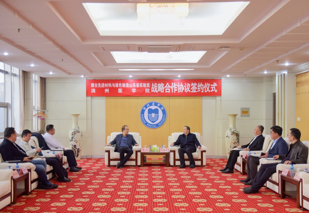 签约仪式前,党委书记车先礼会见了周峰。车先礼首先对周峰一行表示欢迎,并向客人介绍了学校近年来改革发展和构建“两优两特”办学格局情况,并就“双一流”建设、师资队伍、科学研究、人才培养等方面进行了深入交流。周峰介绍了中科院兰州化学物理研究所及烟台先进材料与绿色制造山东省实验室情况,烟台先进材料与绿色制造山东省实验室是山东省启动的首批省级实验室之一,实验室按照“实行全新体制机制,对标一流科研平台”的工作原则,打造“省实验室+产业技术研究院+孵化加速基地(初试、中试及小规模生产)+科研创新总部基地+产业发展基金”五位一体,面向山东、辐射全国的先进材料和绿色制造创新示范体系,努力成为在先进材料与绿色制造领域有国际影响力的研发基地,成为国家物质科学研究和绿色过程制造创新的重要组成部分。车先礼表示,滨州医学院愿与烟台先进材料与绿色制造山东省实验室开展务实合作,将发挥医学院校在人才、科研、平台等方面优势,与省实验室优势互补,互惠互利,为服务山东经济社会发展做出更大的贡献。