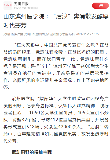 11月12日,《光明日报》全媒体平台以“山东滨州医学院:‘四维发力’,确保党史学习教育‘不断线’”和“山东滨州医学院:‘后浪’奔涌散发醇厚时代芬芳”为题两次报道我校党史学习教育亮点工作。