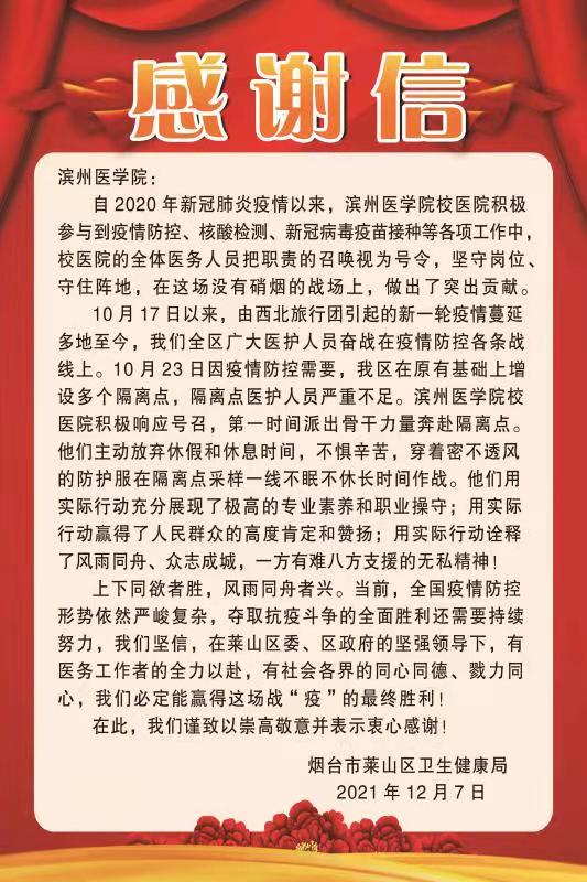 12月8日,莱山区卫健局副局长王振昱一行2人专程到校送来感谢信,代表莱山区卫生健康局感谢我校校医院的医务工作者无私奉献支援莱山区疫情防控工作,表达对校医院全体医护员工的感激之情。我校后勤管理处、校医院主要负责同志接受感谢信并与王振昱一行进行了座谈交流。