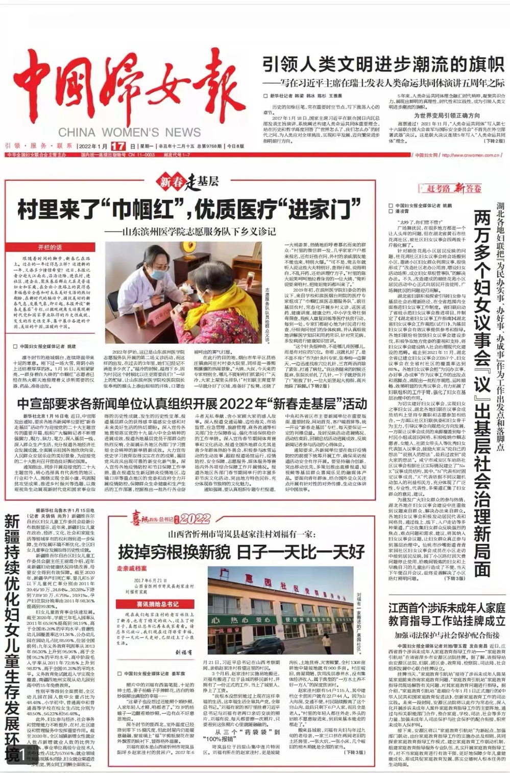 1月17日,《中国妇女报》在头版头条“新春走基层”专栏报道我校“巾帼红”志愿服务队下乡义诊活动,他们奔走在冰天雪地,跋涉在田间地头,哪里有需要,哪里就有她们的身影。这群白衣天使,用大爱和奉献,展现了巾帼精神、巾帼担当、巾帼力量,为群众身心健康送上最温暖、最坚实的力量。