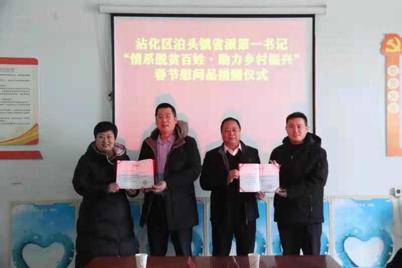走访慰问前,“第一书记”工作队在徐万粮村举行简短的春节慰问品捐赠仪式。沾化区委副书记迟振海,组织部副部长高双海,泊头镇党委书记王敏,镇长潘林林,省派“第一书记”姜海、王希杰、王嵩、李玮,镇有关科室负责同志,徐万粮村党支部书记李克增及部分村民代表参加捐赠仪式。