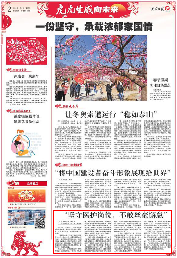 一份坚守 承载浓郁家国情。2月2日,大众日报专版报道春节期间,依然坚守在工作岗位的一线劳动者,并以《坚守医护岗位,不敢丝毫懈怠》为题,报道我校滨州附院春节在岗的李洪波事迹。