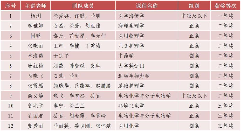 经过精心准备、共同努力,学校在本次省级决赛中取得优异成绩:15位教师(团队)参加省级决赛网络评审环节,9位教师(团队)入围省级决赛现场汇报环节,两个环节的入围教师(团队)数均为全省最多。最终,基础医学院杨玥教师团队荣获中级组一等奖并获得国赛参赛资格;基础医学院李雅娜教师团队、基础医学院闫鹏教师团队、护理学院张晓丽教师团队荣获正高组二等奖,护理学院张雪雁教师团队、中西医结合学院林海燕教师团队、康复医学院肖晓飞教师团队、外国语与国际交流学院庞红梅教师团队荣获副高组二等奖,基础医学院商文静教师团队荣获中级组二等奖;基础医学院孔丽君教师团队、公共卫生与管理学院董兆举教师团队荣获正高组三等奖,药学院(葡萄酒学院)董秀丽教师团队荣获副高组三等奖。