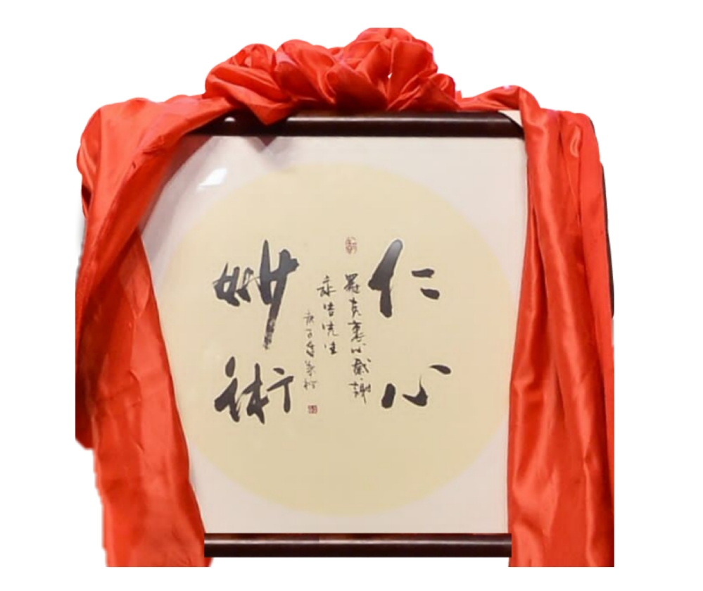 牟永告教授捐赠的写有“仁心妙术”校训的书法作品