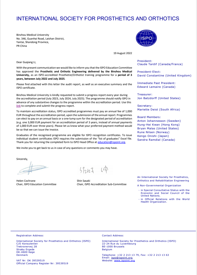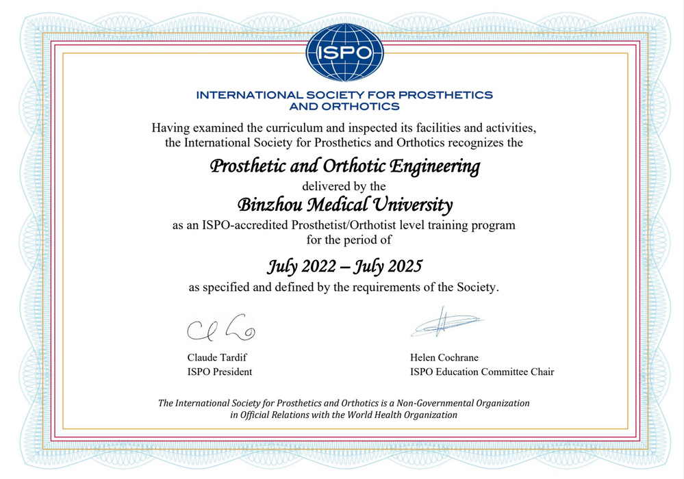 8月19日,国际假肢矫形学会(International Society for Prosthetics and Orthotics,ISPO)教育专委会正式向我校颁发国际假肢师与矫形器师教育标准认证证书,有效期为3年(2022-2025年)。至此,我校假肢矫形工程专业高质量通过ISPO假肢矫形工程专业国际教育标准认证。