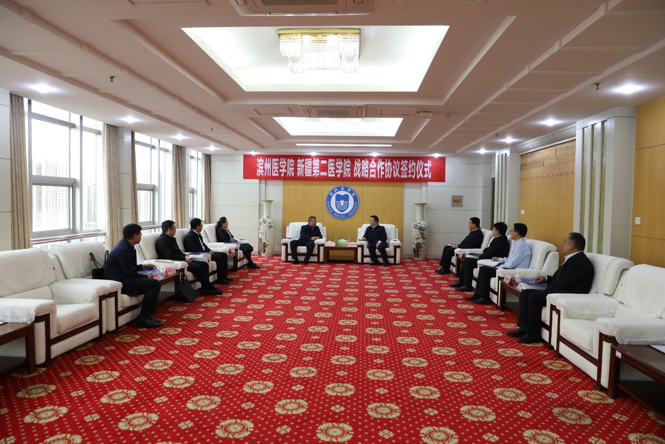 10月13日上午,学校与新疆第二医学院签署战略合作协议。校党委书记孙祥军,党委委员、副院长赵景刚,新疆第二医学院党委书记冯述江,党委常委、副校长徐培兰出席签约仪式。