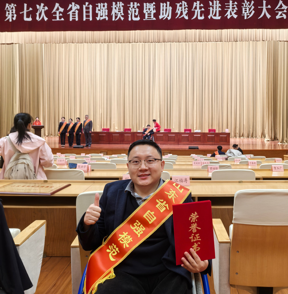 我校特殊教育与康复学院教师刘杨被授予“山东省自强模范”称号。刘杨自幼与病痛相伴,却以“向命运宣战”的勇气突破身体局限,从签署山东省首份在校大学生器官捐献协议,到创建国家级志愿服务组织;从一度绝望退学,到最终成长为基层康复先锋。他扎根特教事业,带领团队长期深入基层,为数以千计的残疾人士提供康复服务与技能培训,将个人经历熔铸成奉献社会的火炬。其感人事迹曾两次登上《中国青年》杂志封面,并获《中国教育报》、人民网、中国青年网等多家主流媒体深度报道;山东电视台《教育会客厅》也曾专题报道其团队事迹。他以弯曲的脊梁,铸就了挺拔的人生,生动诠释了自强不息的时代精神与学校“仁心妙术”的校训内涵。