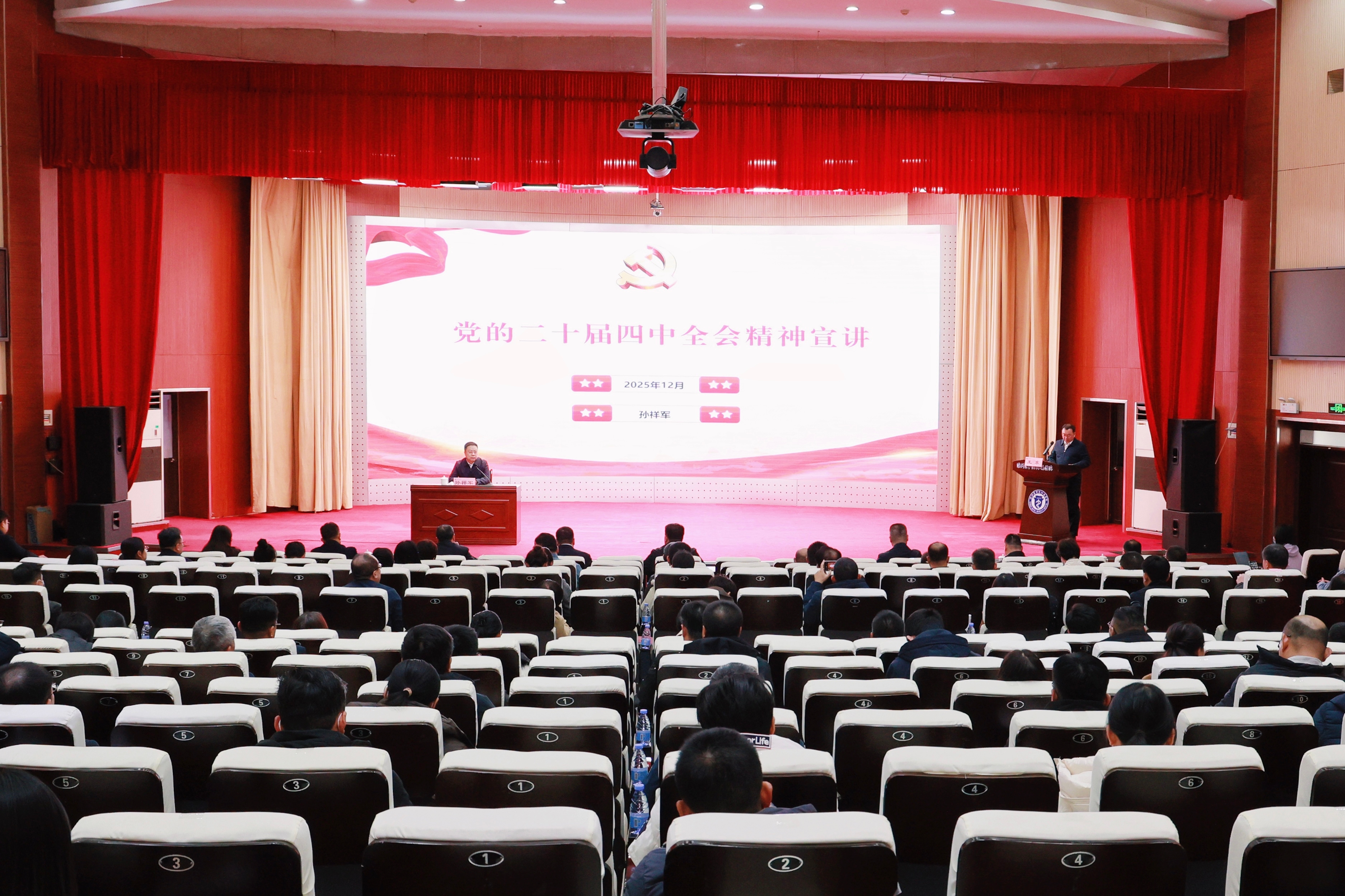 为深入学习贯彻党的二十届四中全会精神,统一思想、凝聚共识,12月3日下午,党委书记孙祥军为滨州医学院附属医院、附属中医医院党员干部宣讲党的二十届四中全会精神。党委委员、副院长赵景刚,党委委员、宣传部部长顾玉春参加。