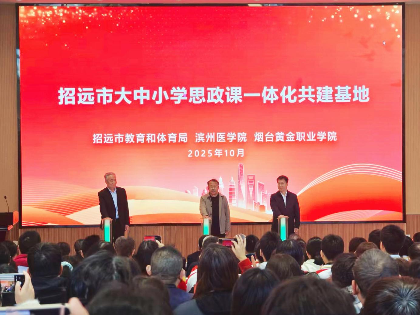 10月31日上午,学校联合烟台黄金职业学院与招远市教育和体育局共建大中小学思政课一体化基地揭牌活动在山东省招远第一中学举行。校党委副书记于景科,烟台黄金职业学院党委书记王广成,校党委委员、党委宣传部部长顾玉春,烟台市委教育工委副书记、市教育局党组成员、副局长王诗龙,招远市委教育工委常务副书记、市教育和体育局党组书记、局长滕希田出席活动并分别致辞,共同见证共建基地落地。